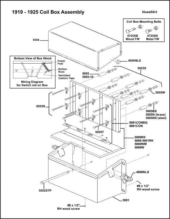 As Scott described: the coil box is a likely for a non-starter style have a two posts (mag & bat) as the voltage source for the coils. It may have been done because the BAT wire from the switch to the post on t he box is broken. Another possibility is that someone may have put new wood in a "correct" coil box and inadvertently connected the wire from the center strip to the MAG post instead of the BAT Post. The wiring diagram "bottom view" is referring to the groves cut in the wood. Currently all replacements are made for the earliest style box. Once wired the grove side goes face down into the box - its easy to get turned around when wiring it up.