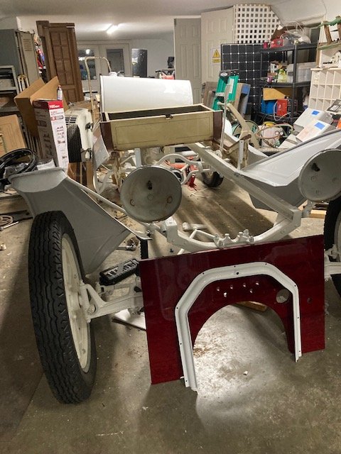The fenders running board, firewall, steering wheel, steering column, hood former, headlight buckets and gas tank are back from the body shop.