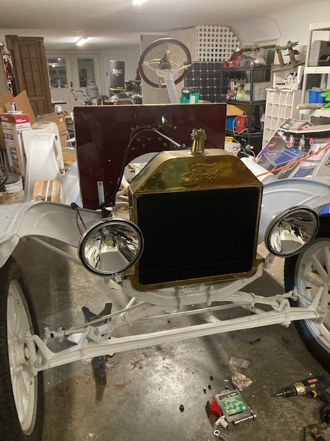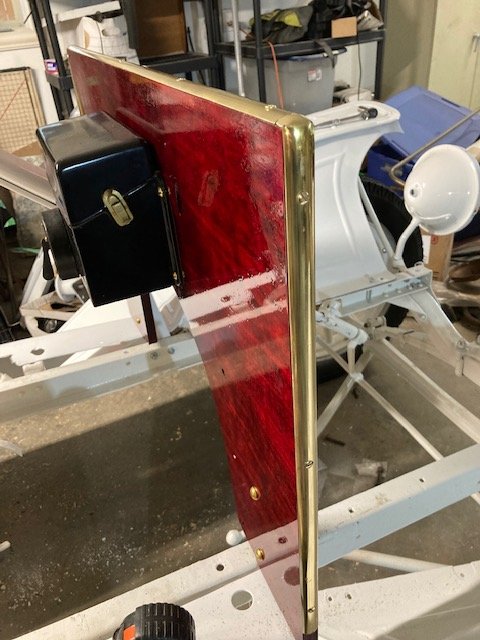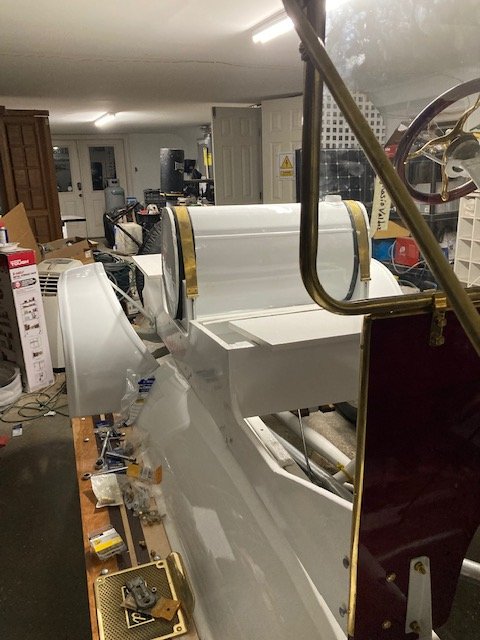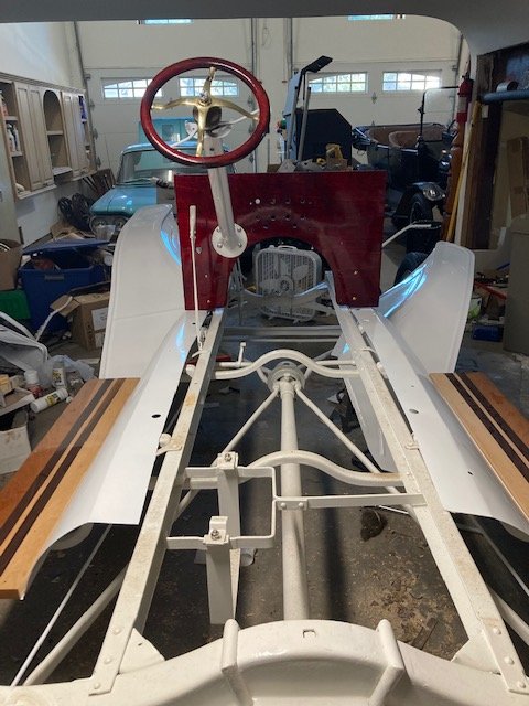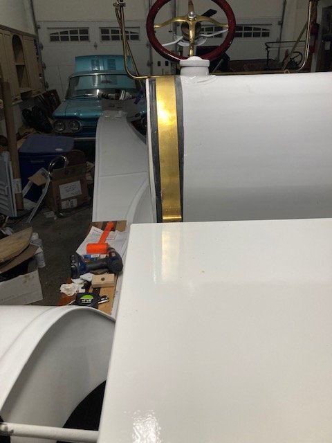 The coil box and coil boxes are in. Brass trim is on. Fitting the fenders and running board. The wood body comes back from the painter Wednesday.