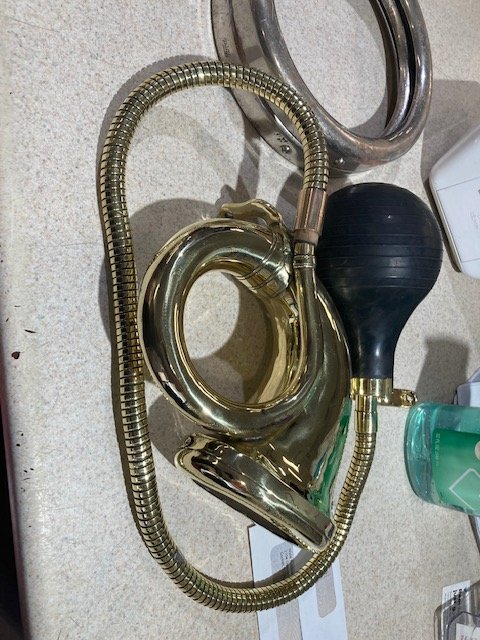Horn is back from the music shop after polish and repair. I used a brass Hillman bushing as a connector, the music shop put a cork seal on to make it detachable and it worked well. Windshield glass is here and the frame is test fitted. Exhaust and muffler are in place. Fuel line is next.