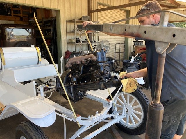 Quite an adventure today. I trailered the speedster to Ross Lilleker's in College Station, Tx for installation of a motor. It went well all done in 1 day. It now runs and drives well! No longer a hay wagon, back to being a Model T. So far so good. Watching Ross work was like watching a surgeon.