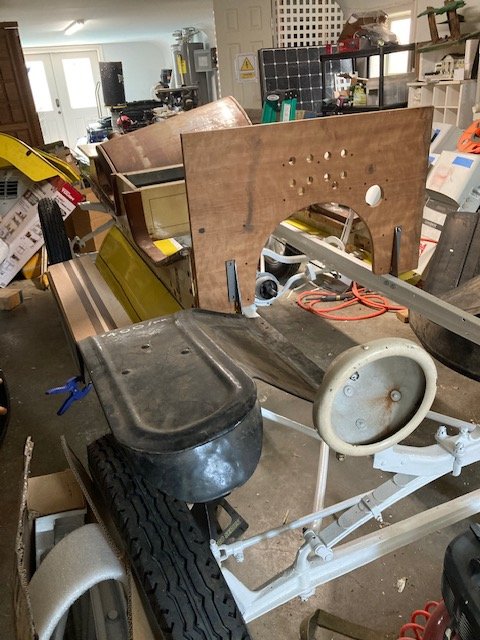 The seat looks like porcupine quills. Those are toothpicks dipped in wood glue and pushed into the old tack holes so that the new tacks will stay firm. They will be clipped off when dry then sanded down. I didn't want to wreck the 1912 body I have by modifying it as a Speedster body. It also has some delamination issues to repair and paint to strip so I am just building a new body which so far isn't too difficult.