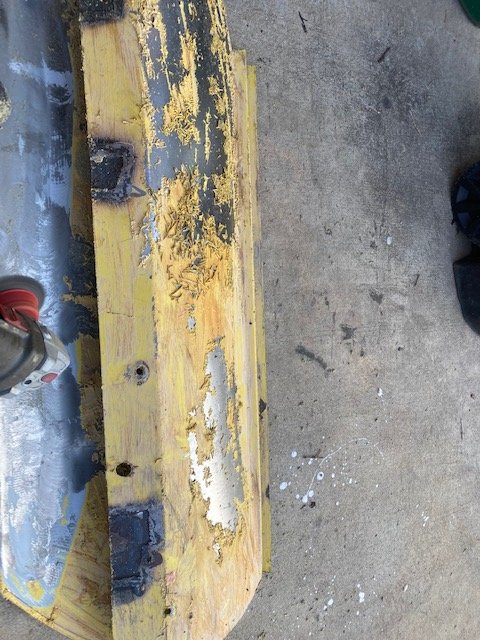 More progress. The skirts are welded, ground, stripped with Citri-strip then phosphoric acided and ready to paint. My amateur weld job should not show with the body on. The wire brush wheel on the grinder is very effective but flings steel hairs at me. Stripped paint goes everywhere too. I had to wash the other cars and garage door afterwards so that thrown bits of stripped paint don't strip the other cars and garage door. Some of them penetrate the skin on my legs like some weird acupuncture that I discover attached to me later and have to pull out.