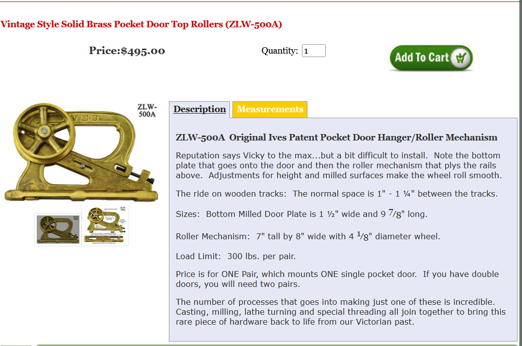 Maybe but doors then where much taller, wider, thicker and solid wood, not like Today. Note the hand truck to move the door="by jiminbartow » Sat Aug 21, 2021 2:01 pm wrote: Judging by its’ heavy duty cast iron construction, I would guess that this is more for a big sliding garage door, rather than a pocket door. Jim Patrick