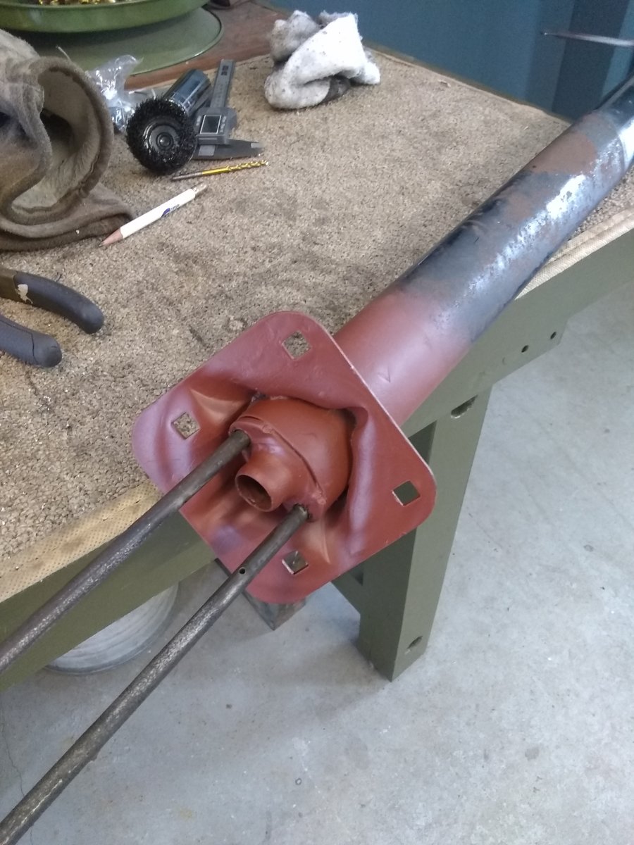 Work on the steering column has continued at a slow pace, I finally finished filling in the pitting and got it in the paint booth tonight...