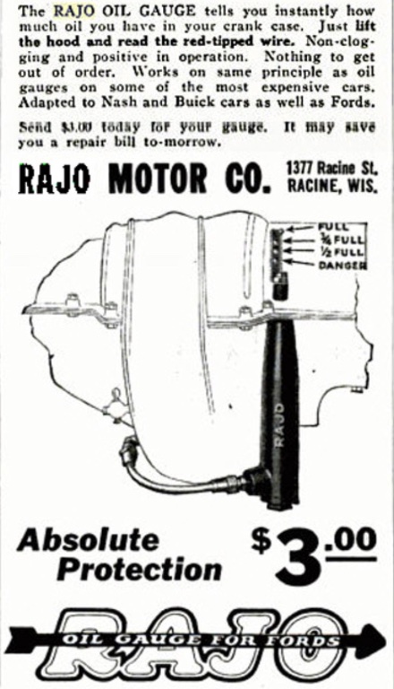 I don't mind the stopcock type oil level check on a tractor, where you can just walk up and make the check. On a T, you have to get under the car, and if the wind is blowing, you'll probably get oiled. Another disadvantage is waste, and the fact that you can't tell much about how far above the bottom cock the oil level is unless you fill it up until it runs out the top one. In cold weather, getting an accurate check can take a while. In hot weather, you can get burned handling the stopcock handles. The cocks can also stop up, which a dip stick is unlikely to do. One of the many practical improvements offered on the Model A Ford was the dipstick.