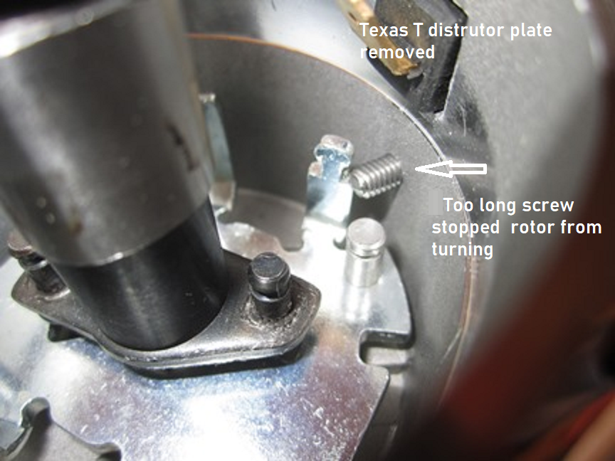 It looked like it had a Texas T distributor on it. The bottom part had Texas T stamped right on it. So we followed the directions from the Texas T site to time the distributor, it worked, and we went with it. The car has been running on and off the last year. It never, until 2 days ago, occurred to us that this wasn’t a true Texas T distributor. No one ever shows pictures of the inside, just the outside.