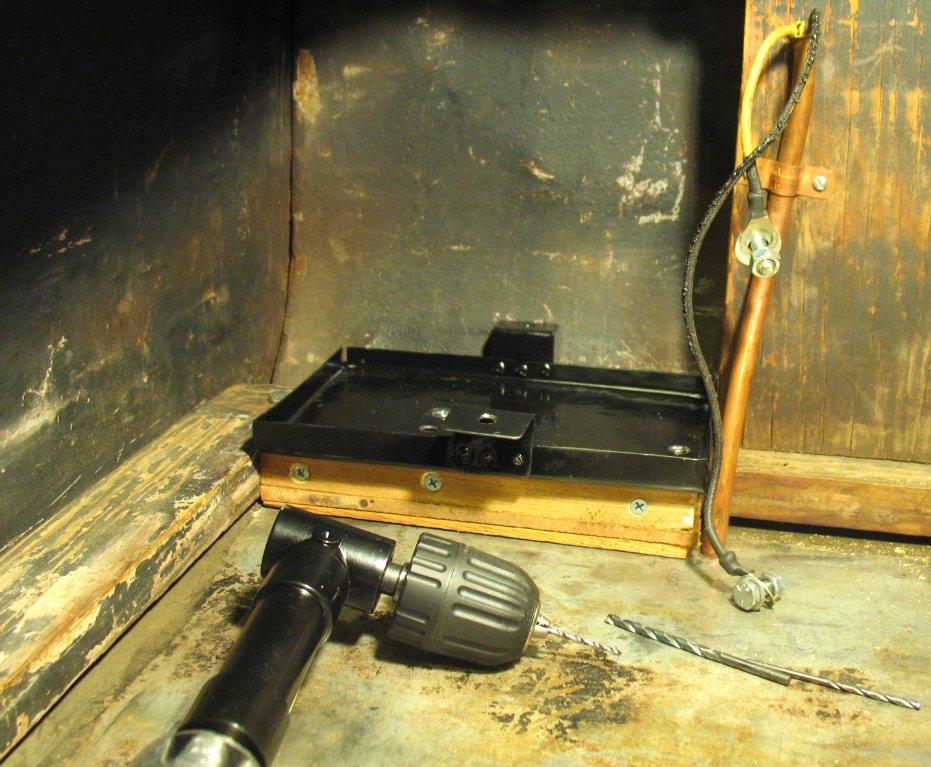 I may make a metal hold-down, but for now a rubber tarp strap will do. This is the first step in an electrical makeover.