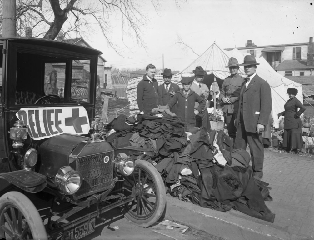 The photo isn't staged. I've seen hundreds of photos from the Easter Sunday 1913 tornado that destroyed much of my old neighborhood. There are other photos of clothing drives after the storm.