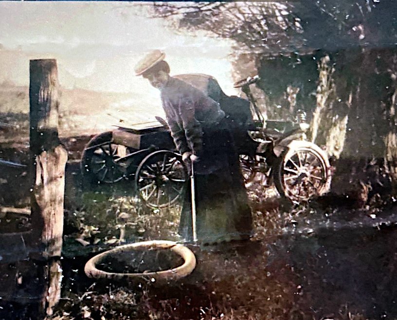 Here’s a picture that was posted on a local forum of a family’s Great Grandmother trying to fix a tire. It was taken between 1910-15. Is it a very early Ford before the Model T or Olds or??