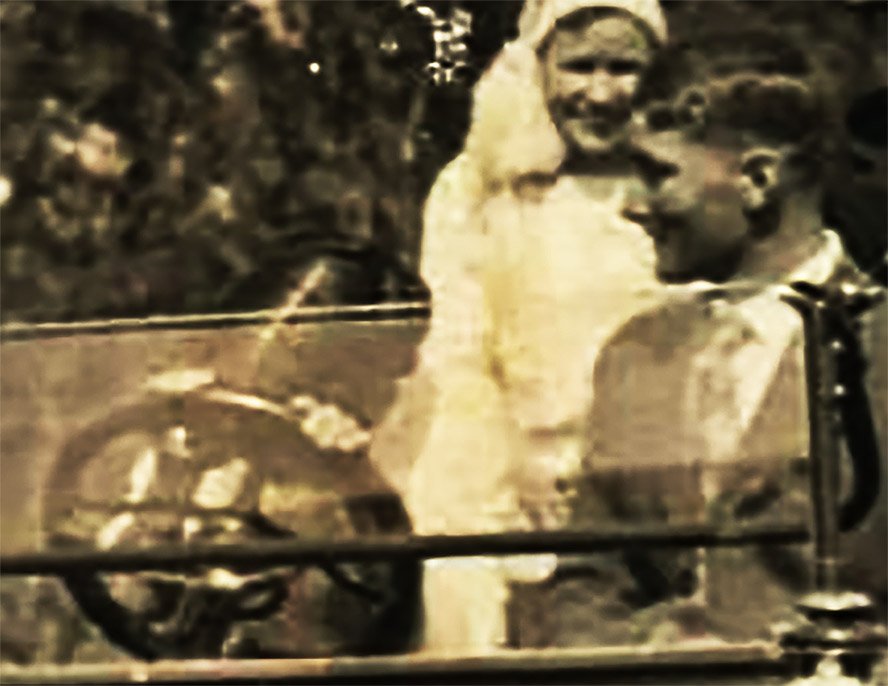 When blown up to 400% it appears to be a woman who has her hair parted down the middle with a crown of curls around the edges. Her head appears to be tilted foreward almost touching the steering wheel, wearing a white blouse or dress and green eyes. Oh I got carried away!!!