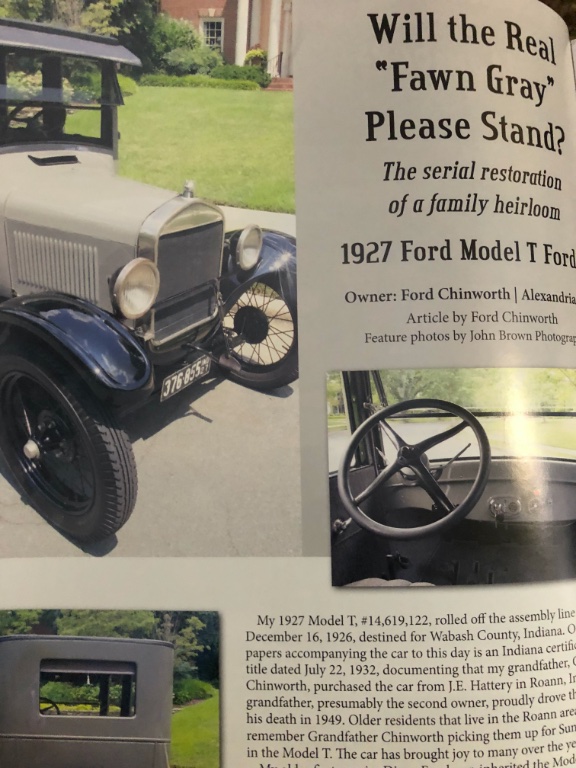 This owner restored a family heirloom sedan that was painted over in Green, locating original paint under parts , he researched and found the color match to be Ditzler Prroxylin #30575 Dawn Gray/Ford Fawn Gray. He also used another known original car in that hue to match this color exactly.