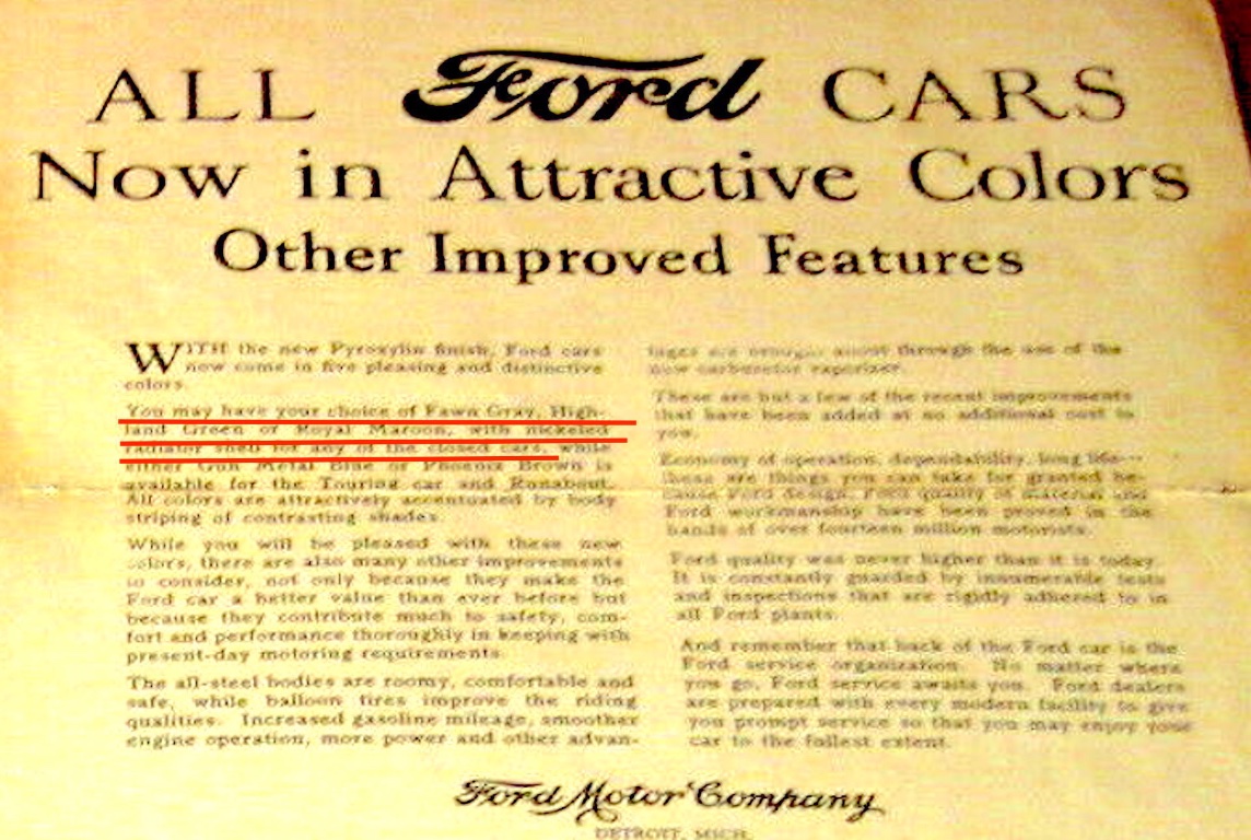 McCalley's "Model T Ford" book (page 403) states "By the fall of 1926 (1927 models?), all closed cars were apparently painted in a choice of three colors: Royal Maroon, Highland Green, and Fawn Gray." The article goes on to say later production used the new Pyroxylin paint. It lists those colors as Black, Highland Green, Royal Maroon, Fawn Gray, Gunmetal blue, Phoenix Brown, Commercial Green, Moleskin and Drake Green.
