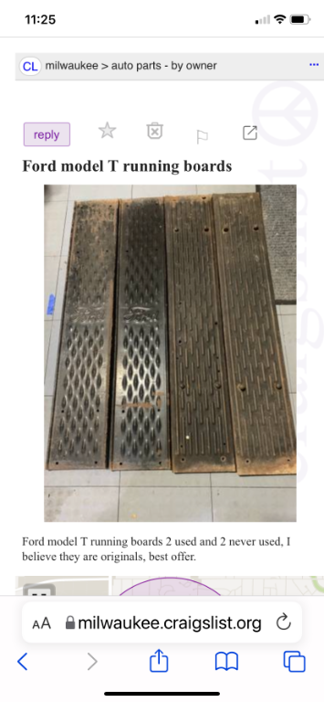 For what it’s worth, saw these on Craigslist thought I’d pass along. Do not have anything to do with Sellers but looked interesting. Worth the ?? Could those actually be original 1910 running boards. That would require an inspection.