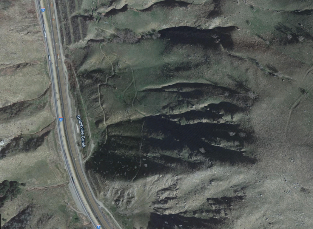 A satellite view shows a faint trace of the north end of the original Grapevine grade where it descended into the San Joaquin Valley. That was long before the song, before my time, before the US highway system. It was opened in 1915 and paved with concrete between 1917 and 1921.