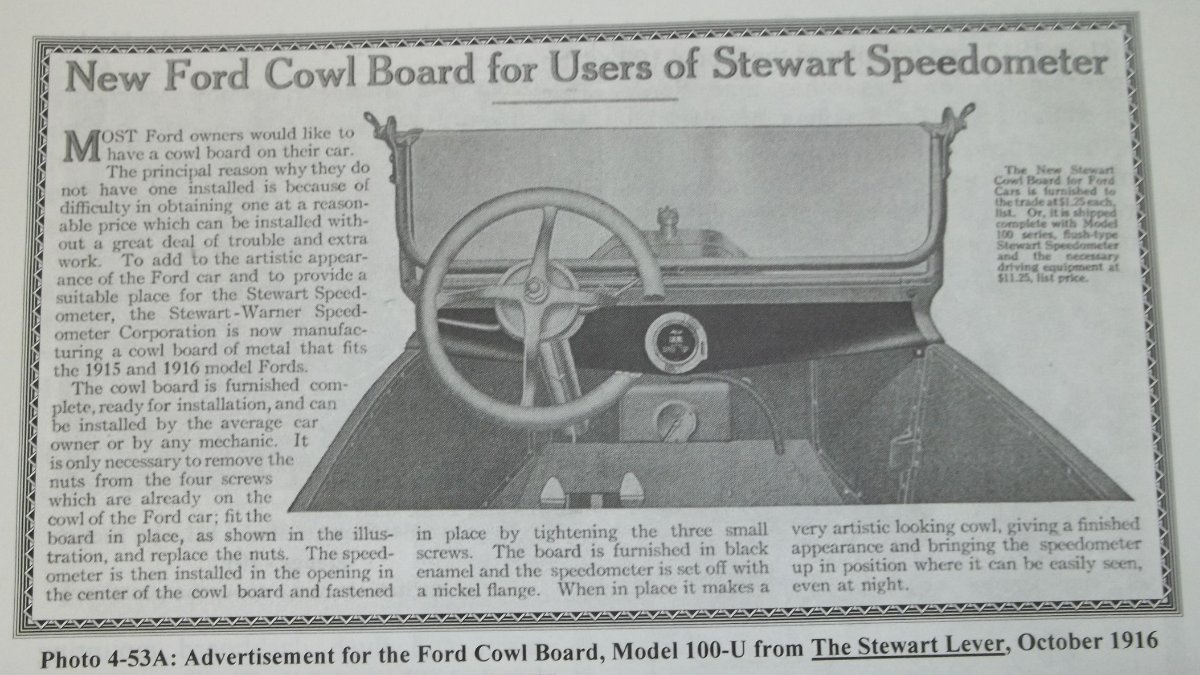 Accessory dashboard were available from Stewart Warner. I would not change the coil box as your car was originally a non-starter car. Here are a few photos of what Stewart Warner offered. I hope this helps, Russ Furstnow