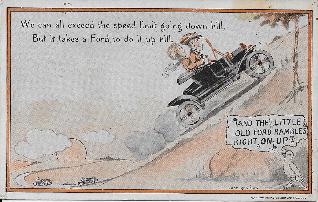 It was about that time that Shinn came to the attention of the Ford Motor Company. It seems that Henry Ford recognized that the jibes at his Model T (first built in 1908) could be turned to his advantage. Shinn began providing humorous cards poking fun at the Model T. Henry Ford is reputed to have said that “every time someone laughs at a joke about the Model T, I sell another car.”"