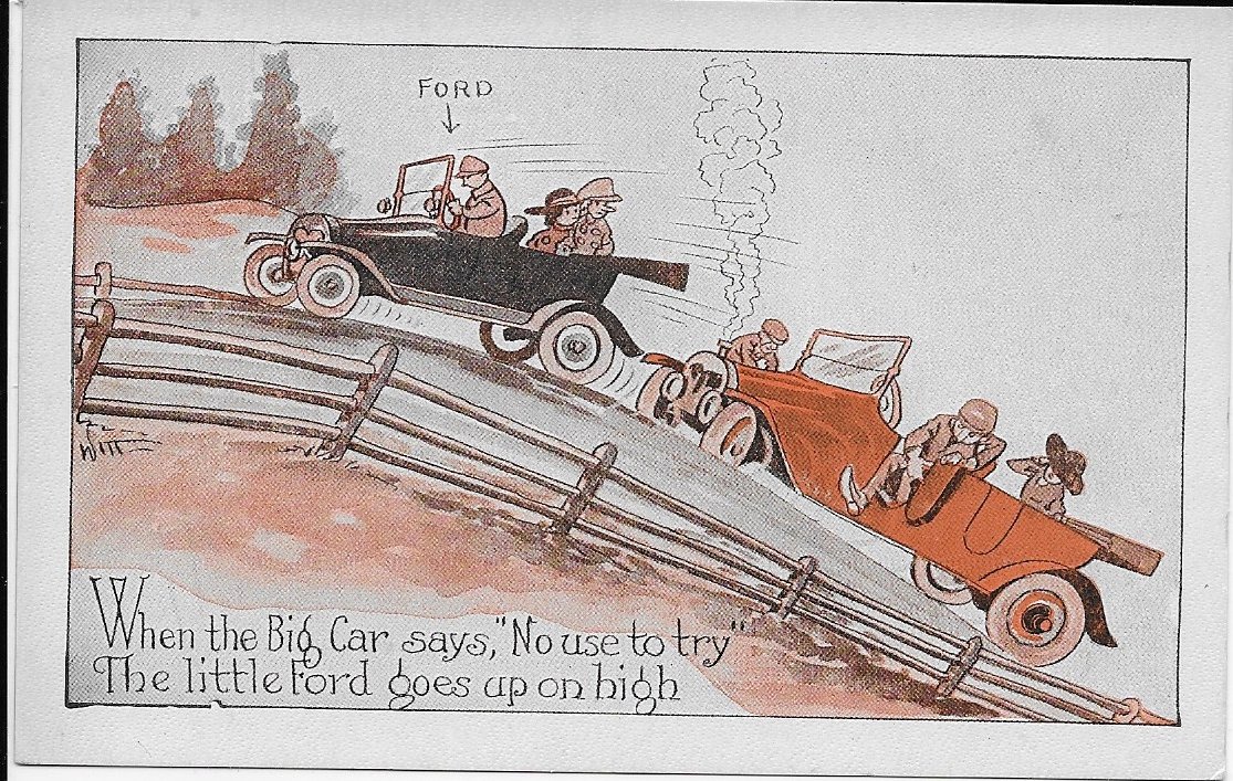 One of my favorites was climbing pikes peak - "While the big cars are stuck around the beanery, the Ford car goes up and enjoys the scenery."