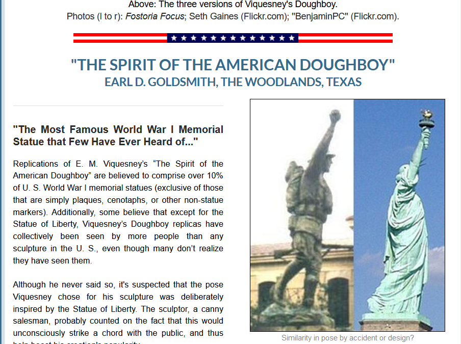 The information about "The Spirit of The American Doughboy" indicates that almost every city/own erected a variant of the original. Sculptor and artist, Ernest Moore Viquesney, was the man behind the famous doughboy statues installed throughout the country to honor World War I Veterans. Researchers believe there may at one time been as many as 845 doughboy statues scattered around the country, but only 145 have been documented to date. There are at least 88 remaining. The Bank building in the background of the discussion photo is likely to still exist, but I would guess the status was moved from that location shown.