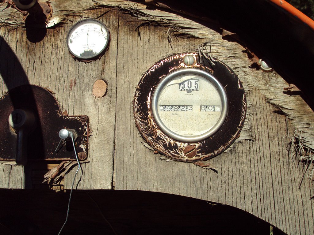 The top was new in 1969 and I rescued it when it was replaced a couple years ago. I suspect the hole was from being folded down for a long time. The metal reinforcement was from too much snow on the bows a while back. The aged, weathered look and make-shift repair fascinate me as much as the shiny restored look of things. The best of both worlds I guess.