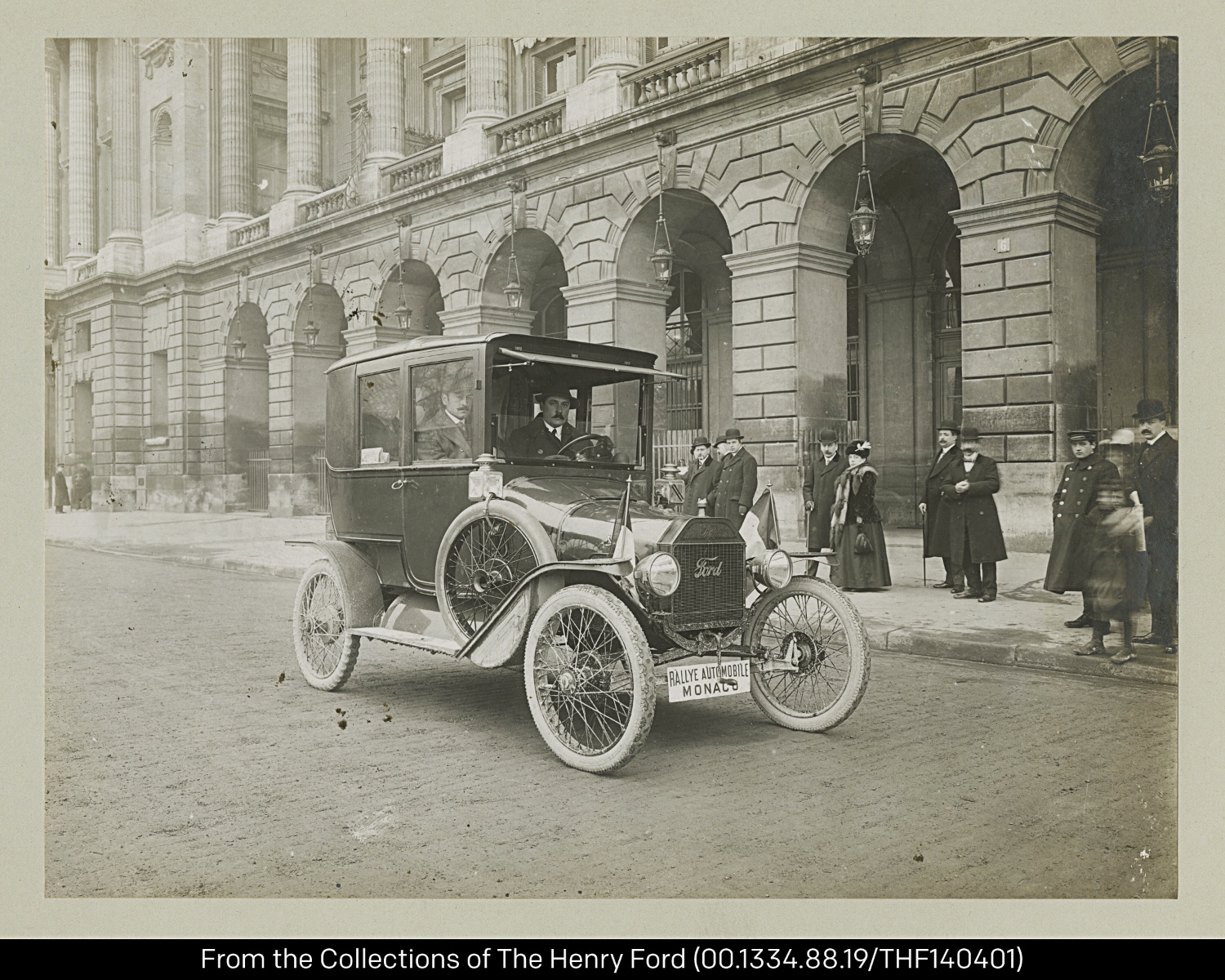 Among the photos of French T's in a photo album at Benson Library was a clear photo of the two door sedan that made the 1912 Monte Carlo Rally. The painted radiator with striping, spare tire fender, along with electric headlamps are interesting early features of this sedan. Since the striping is probably black, I wonder what color the car was?