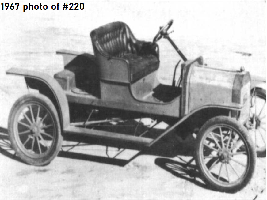 The above 1967 photo is of 220. In that picture, it has its original front seat, drive train, fenders,hood and radiator. As Herb stated, Edward Haugen was the owner at the time of that picture. He sold the car to Ben Snyder, Riverside, CA. Some or most of the car was restored by Al Vivian. I believe it was fully restored when Harrahs bought it. I bought it at auction from Harrahs. It was in good running condition and a beautiful car. The only thing I changed was adding the correct carb. I eventually sold it to Fred Lau, Portland OR. I think it sold in an eBay auction after Fred's passing. It's now on display in Detroit at the Piquette Ford plant. I think it's largely correct and came down through time with most of its original parts.