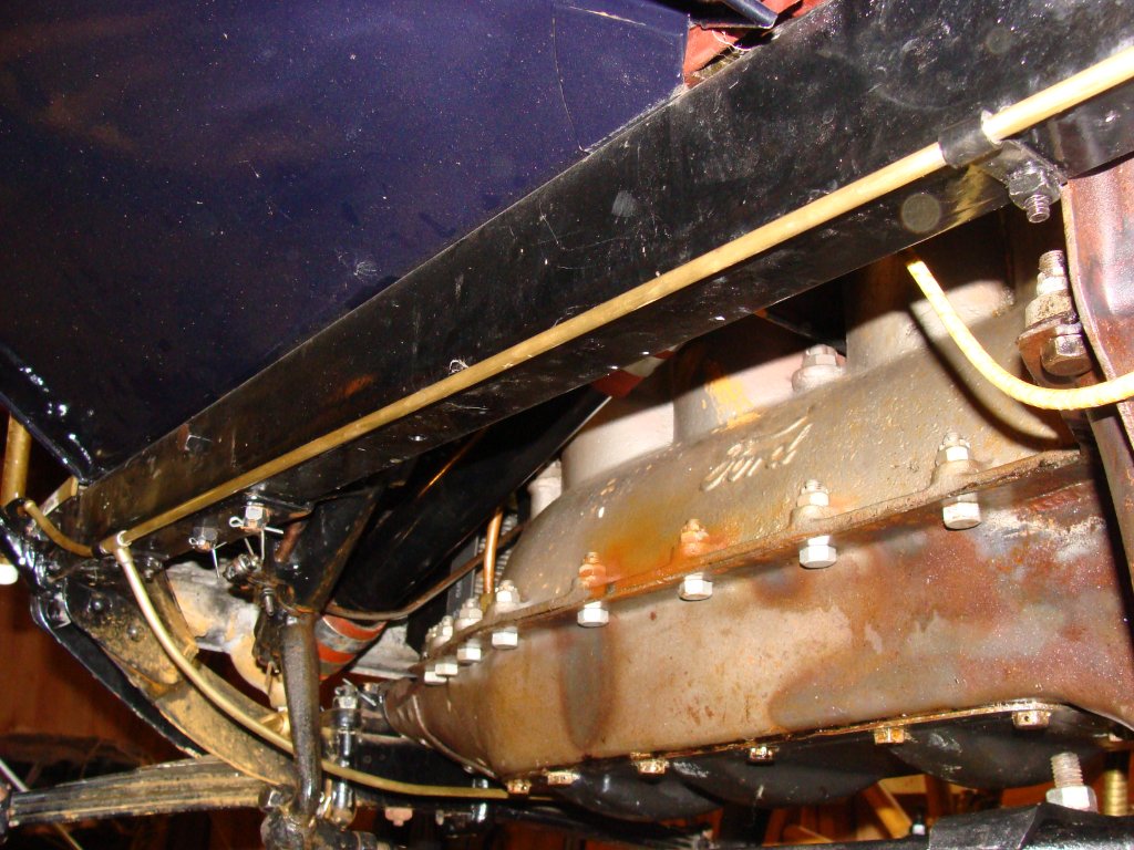Mike, I finally got back under my '12 this morning. Where it is stored it is hard to get under it and there is no good lighting so I can't take pictures but the first clip is as shown in the pictures others have posted right by the clutch/hand brake cross shaft. The second clip on my car is 5" back from the rear bolt holding the steering bracket and uses one of the holes for the engine pan. As I said before I can't swear that this is correct but it is the way I got the car many years ago. As a further caution, the gas line has clearly been replaced at some point when the previous owner added a gas bottle to supply the lamps instead of the acetylene generator.