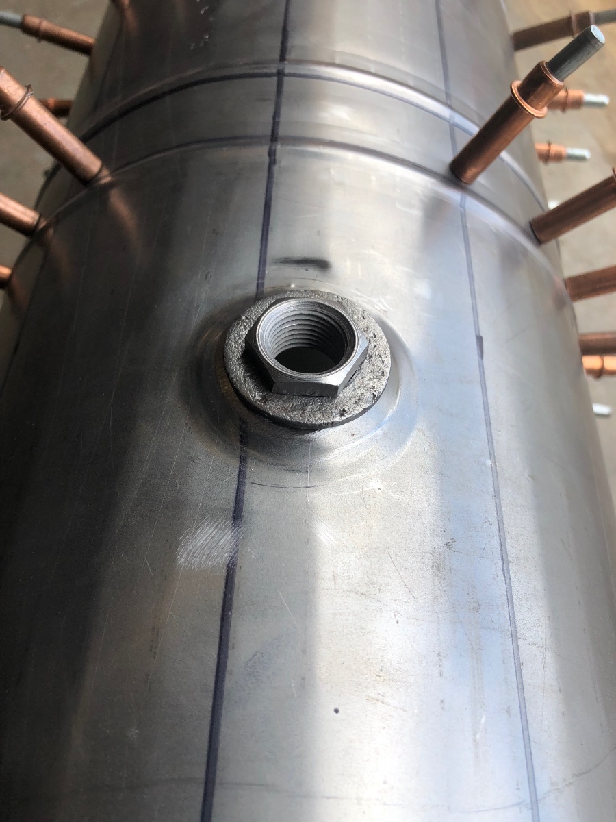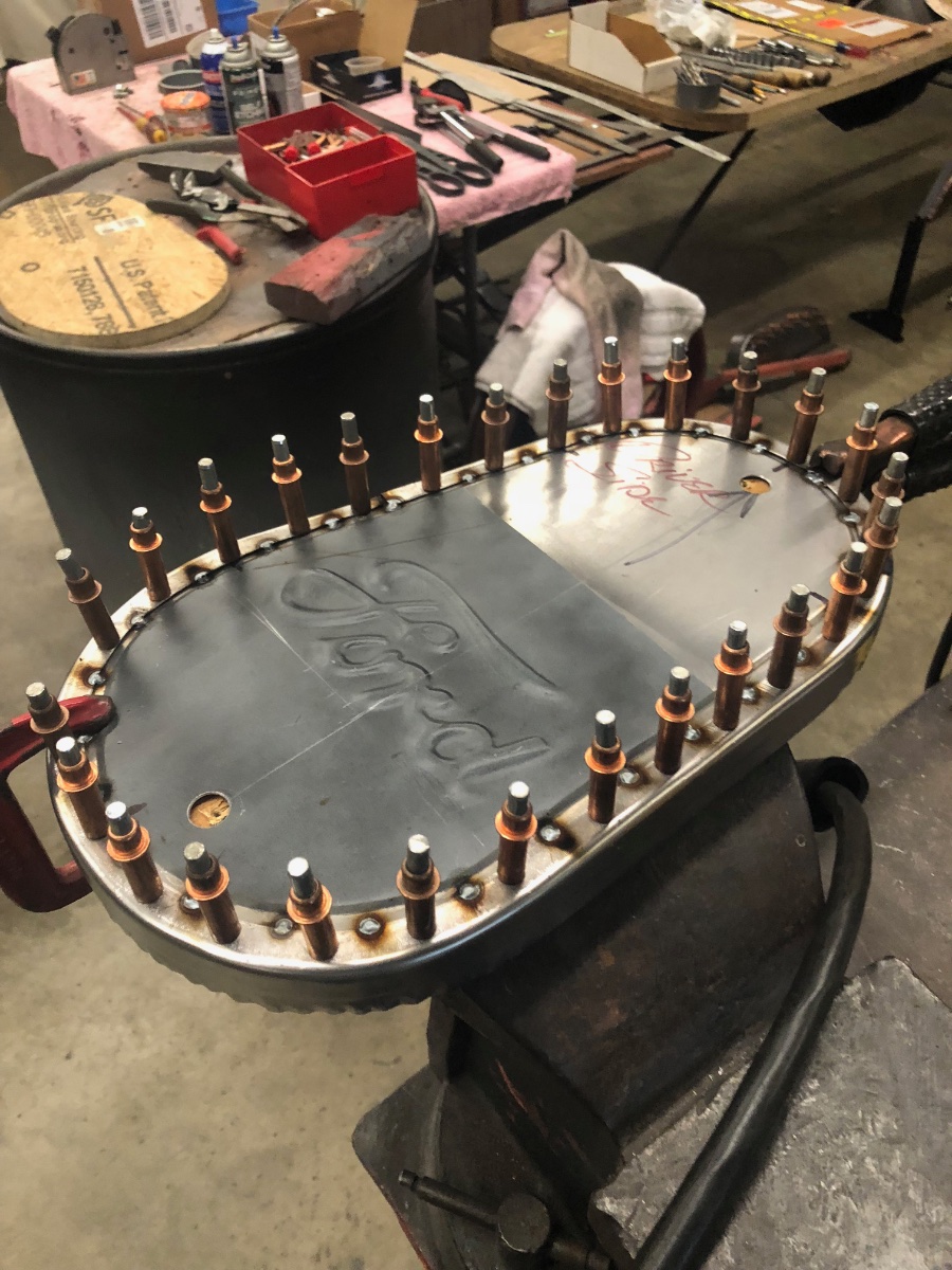 After fitting the outside ring for the end cap to side panel, I leave the wood in place with the Cleco's. By doing this if you cause smoke you are welding to much for to long and the wood helps control heat equally as you bounce from one end to the other preventing distortion. After all "pearl" welding is complete, I come back in very short runs with plenty of cooling cycles and put another weld towards the inner side of the panel. This technique in tin/panel making causes a light tempering of the metal. A very good thing when you are wanting to preserve a shape in smaller panels such as this one with doming. Always use a quality metal for excellent results.