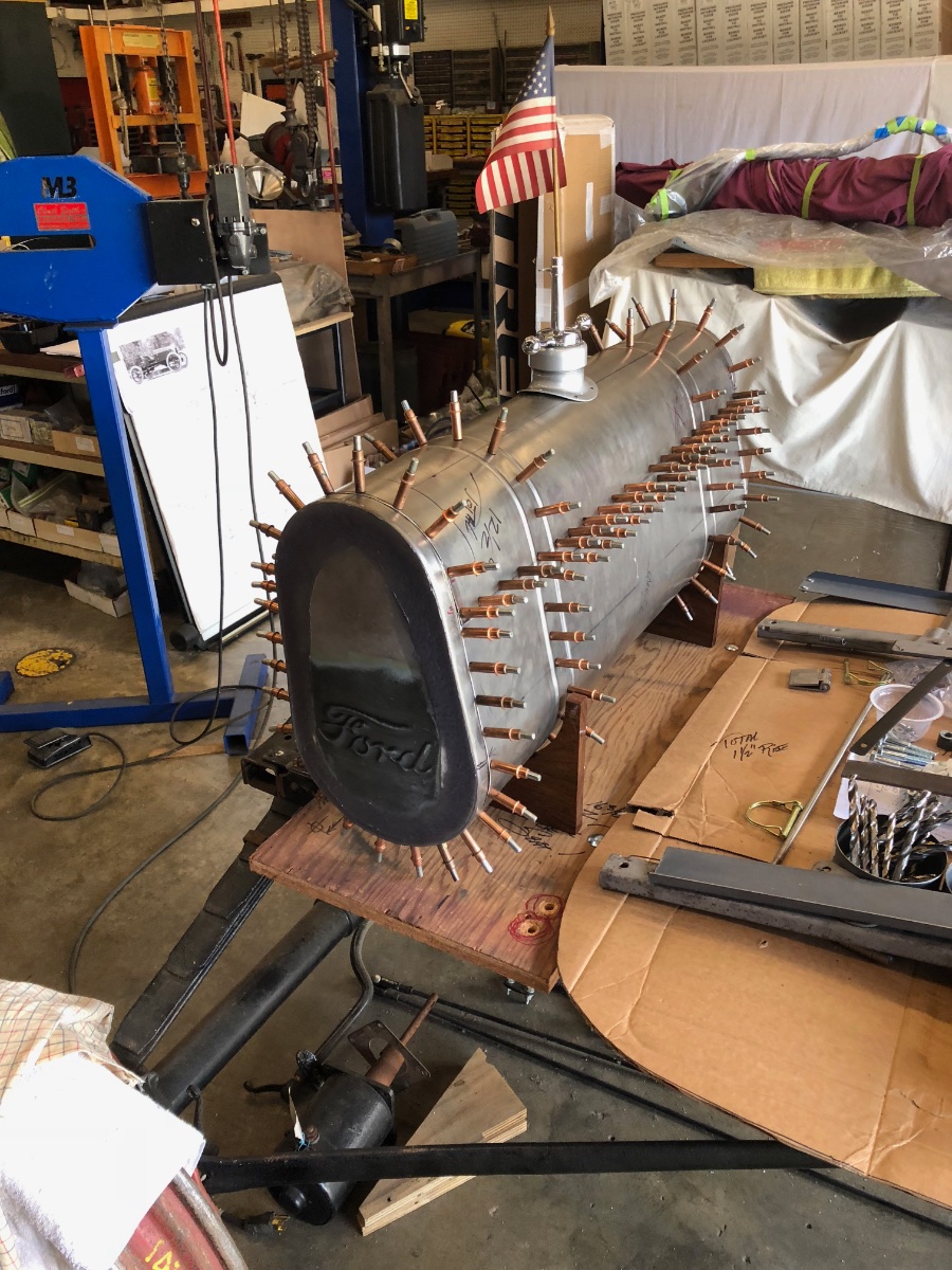 Here are some more photos with extras on how to preserve for years. This fuel tank still has twisting/flex capability due to the welding method on the baffles. If you look closely at their attachment, you will notice from straight plane to curve there is no welding (that is the reversing of the L braces). I only attach the baffles though holes every 1 1/2" apart like a spot weld but with better fusion. I have a spot welder, a very good one (Miller) but I like very good welds on fuel cells. Personal preference.