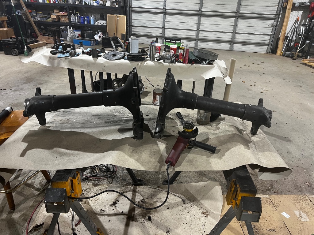 Earlier this week I got all the spring components cleaned up and have started the painting process. I’m using Rustoleum Rust Reformer on all the parts except the perches, which had good paint on them before. They cleaned up nice and bright so I’m using Rustoleum self-etching zinc oxide primer on them. I’ll be topcoating the bottom surfaces of all the spring leaves except the main with EZ-Slide graphite paint, which seems to be doing it’s job on the front spring of my ‘25 express wagon. I’ll topcoat everything else with Rustoleum black satin enamel. That’s what’s on the axle, and it looks good without being too glossy.