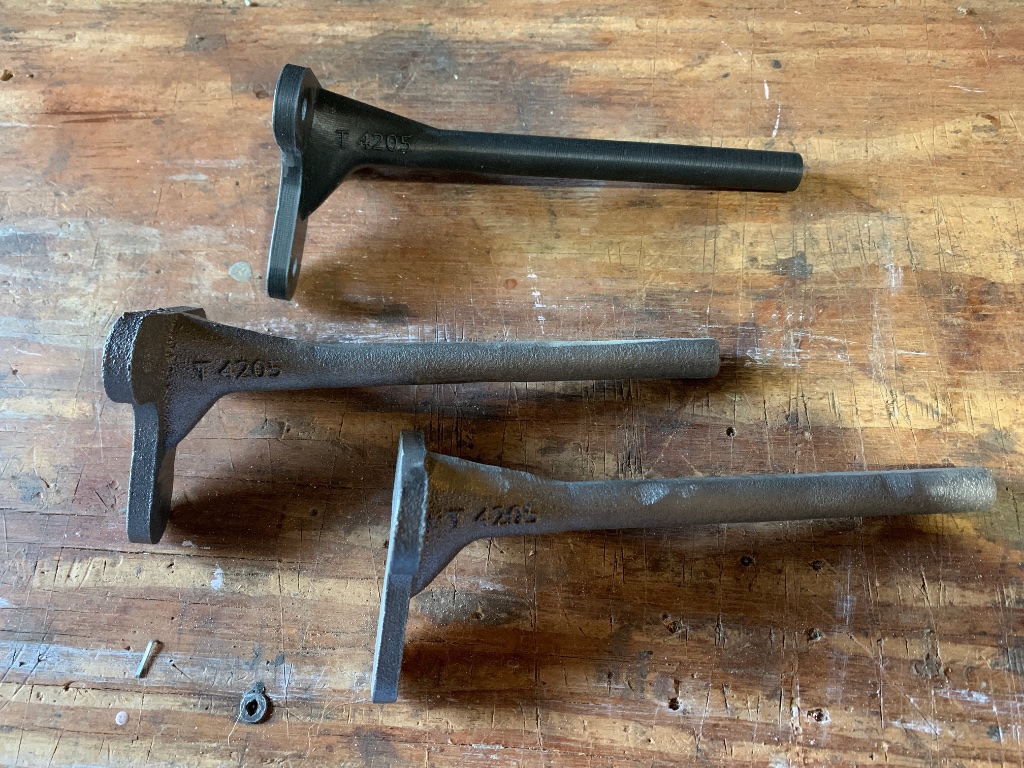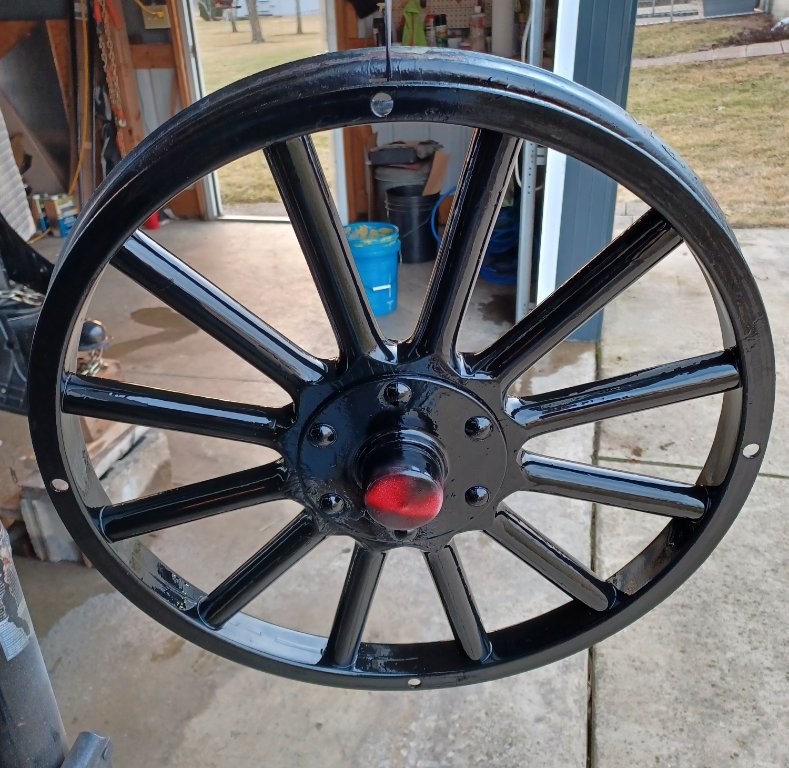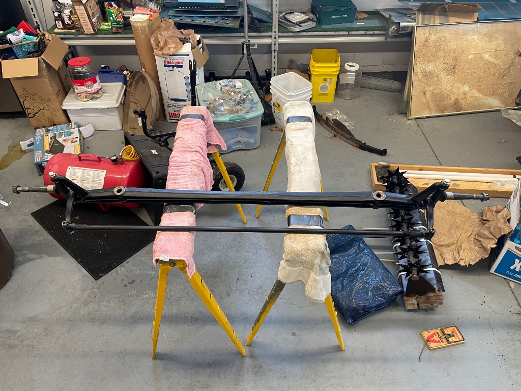 Earlier this week I got all the spring components cleaned up and have started the painting process. I’m using Rustoleum Rust Reformer on all the parts except the perches, which had good paint on them before. They cleaned up nice and bright so I’m using Rustoleum self-etching zinc oxide primer on them. I’ll be topcoating the bottom surfaces of all the spring leaves except the main with EZ-Slide graphite paint, which seems to be doing it’s job on the front spring of my ‘25 express wagon. I’ll topcoat everything else with Rustoleum black satin enamel. That’s what’s on the axle, and it looks good without being too glossy.