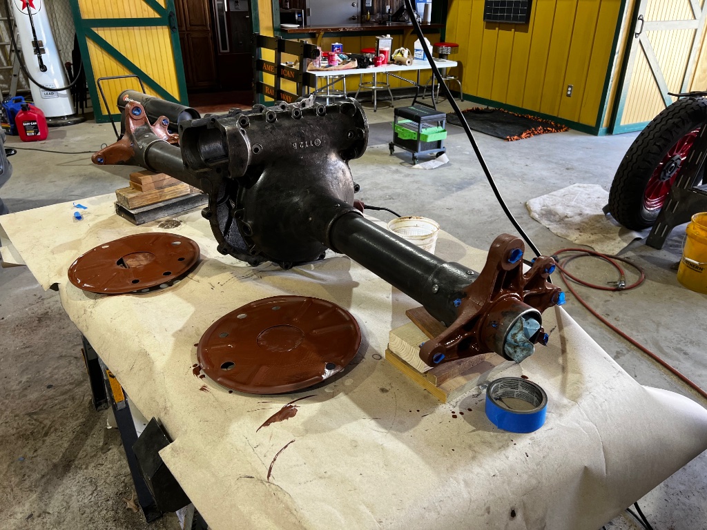 Earlier this week I got all the spring components cleaned up and have started the painting process. I’m using Rustoleum Rust Reformer on all the parts except the perches, which had good paint on them before. They cleaned up nice and bright so I’m using Rustoleum self-etching zinc oxide primer on them. I’ll be topcoating the bottom surfaces of all the spring leaves except the main with EZ-Slide graphite paint, which seems to be doing it’s job on the front spring of my ‘25 express wagon. I’ll topcoat everything else with Rustoleum black satin enamel. That’s what’s on the axle, and it looks good without being too glossy.