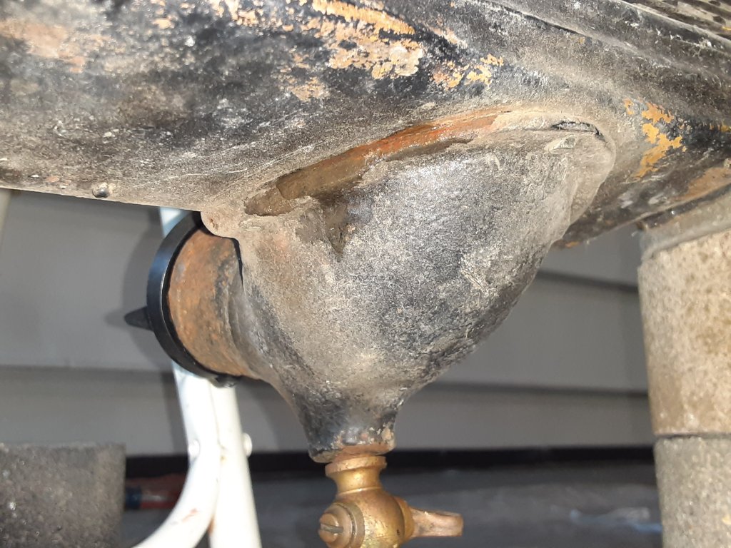 These photos show it after filling it with water. I found two leaks. One at the cast iron outlet, and one in the core. Sorry, the last photo would not go in vertically. A follow up post will show these same locations after about four hours.