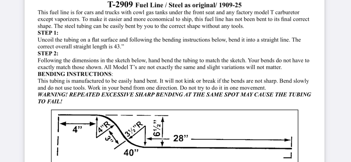 I appreciate the drawing for the bends in the fuel line. However, it would have been nice if the drawing would have included the angle of the bends. After some ciphering, I determined that each angle should be bent at 61 degrees.