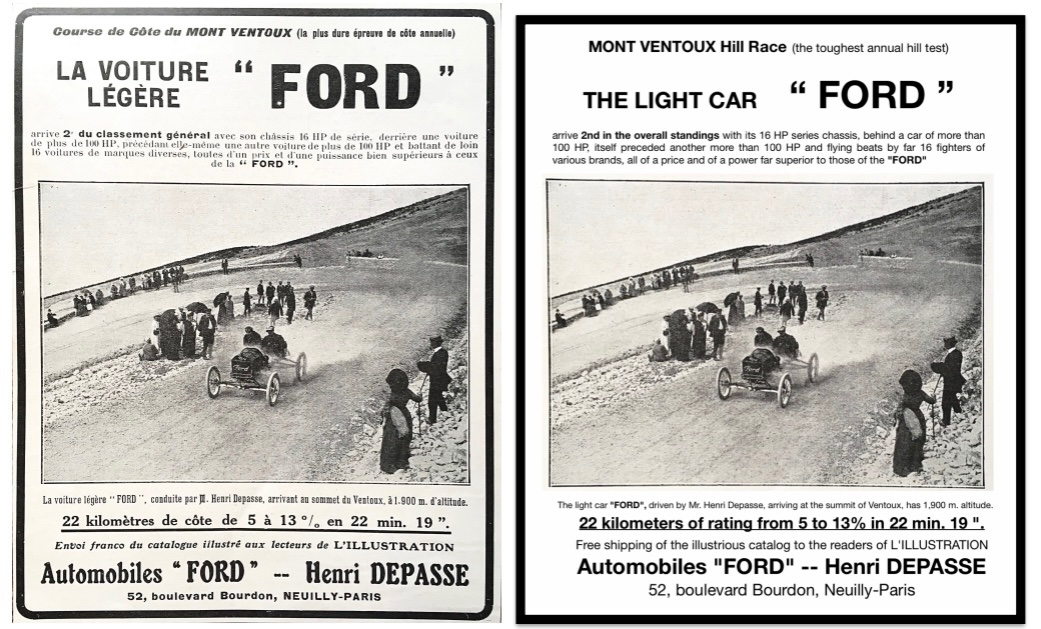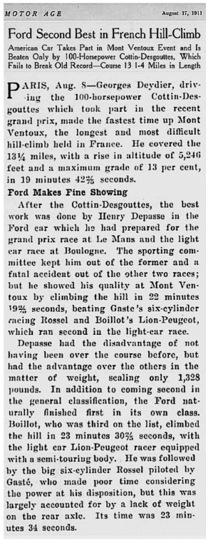 A month later, rebuilt and in racing form, the Ford took 2nd overhaul in the prestigious Mont Ventoux hill climb. It also placed second in two qualifying competitions, a short hill climb and 1 km sprints. When the racer wrecked it was reportedly running over 75 mph.