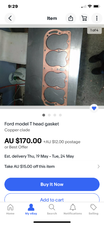 I am selling a lot of Model T parts on eBay and a couple of months ago I listed a hard to get copper Model T head gasket, still in its plastic packaging, with a starting bid of $30.00 and after 32 bids, it sold for $157.50. Needless to say, it was unexpected. The starting bid was $30.00. The bidders determined the selling price, so I was not taking advantage of the unfortunate situation. Jim Patrick