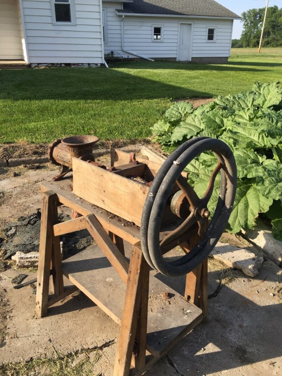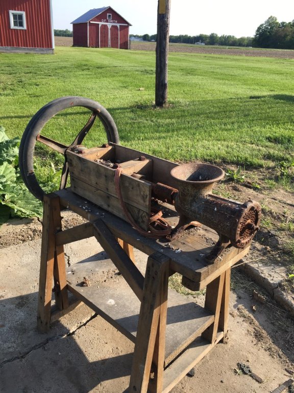 A friend just bought some farmland that included several buildings full of stuff. I liked the design of this sausage grinder, using 2 steering wheels to make a pulley for the belt to ride in and the gear reduction slowing things down. I figured some pictures to the MTFCA crowd would be appreciated.....