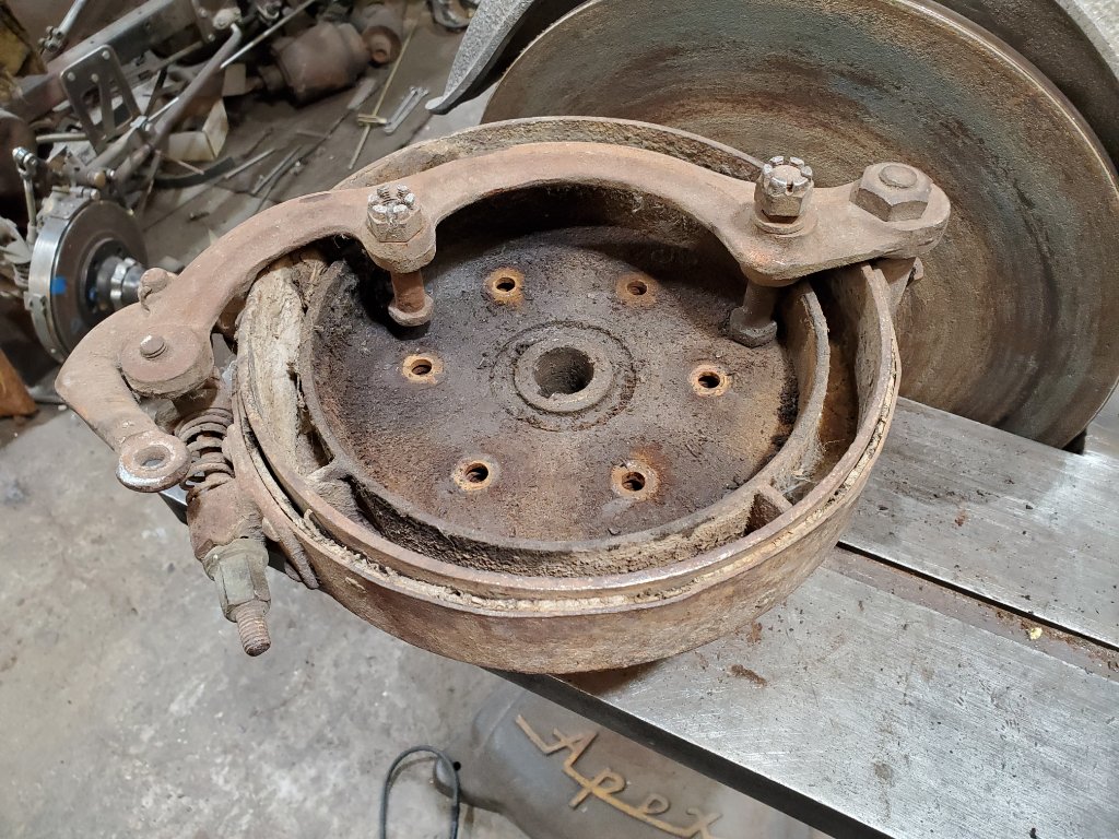 I was able to acquire these outside accessory brakes a few years ago, and finally got to taking them apart to see what they look like. The double drum is cast as a single piece, with the Ford size inside drum and the 10" outside drum. They seem to have little wear, but also appear to have been installed for long enough to accumulate mud, grease, and rust. There does not seem to be any identifying letters or name anywhere on them, but there is a "023" number cast into the mounting bracket / cross bar. I have not been able to find any period ads for anything that looks like these.