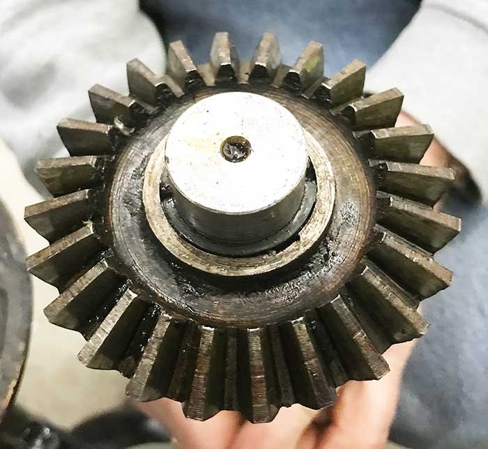 6. With the locking rings removed press the axle down thru the gear and out the other end.
