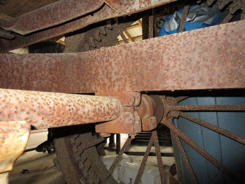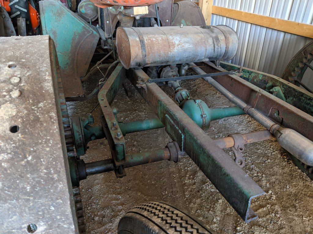 Here are some photos of my tractor conversion mounting points. It looks like some of mine may be mounted a little different than yours. Hard for me to tell from your photos. Maybe some different parts or how a different farmer did it ????? My drive shaft and rear axle assembly is out because I rebuilt my rear axle and have not put it back in yet. I did hold a torque tube in position and sight it to the centerline of the axle housing mounting clamp holes and it looks like I have about 1 inch of clearance between the torque tube and the tractor rear wheels axle. I had never looked real close at how the conversion bolted to the frame. It appears that the rear spring and torque tube is all that keeps the assembly from being ripped out of the tractor by the plow hooked to the draw bar. ?? The front of the conversion is only held in place by a "pinch plate" clamping it to the frame rail. When you look at my photos let me know if you see any major differences.