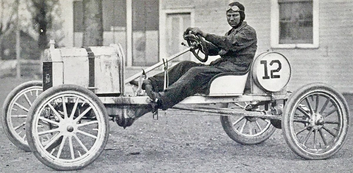 Frank Kulick racing up one of the two hills at Algonquin, 1912, with the big Ford racer. He won both hills and set records on both. Both trophy's are at THF, like the big Ford racer, off display: