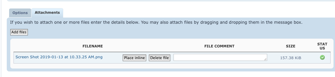 Beneath Add files the name of the picture file will appear. At the far right is STATUS. Green means go. Your file is OK to use. Click Place inline. The photo ID will appear in the composition box.
