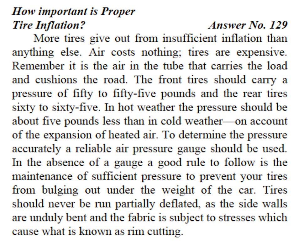 This is from Floyd Clymer's reprint of a Tire and Rim Book. (1915 to 1927) While the new tires are better in many ways than those made in the teens and twenties it serves as a guideline. Note that it says "minimum" inflation. I have been running 40 in the front and 45 in the rear with good luck. I can see more may be better.