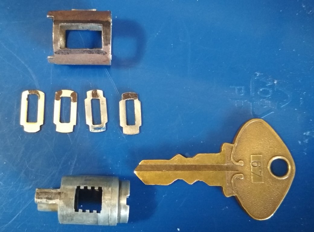 JB Weld to the rescue! (that's cellophane tape creating a kind of mold for the JB Weld). Picked 2 of the new brass wafers (they're all the same) that came with the repo cylinder... ...filed them and got them to fit properly. The marks are to identify the order and positions. The wafers fall into the slot of the sleeve that surrounds the cylinder thereby locking it. The wafers raise up and unlock the cylinder from the metal sleeve when the key is inserted. (excerpted from Locksmithing 101