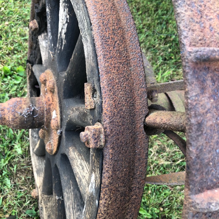 I enhanced the photo. Wood spokes & felloe. Wonder why the cleats are not offset like on most implement wheels