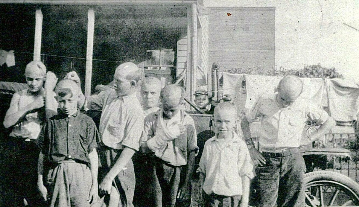There are 3 "boys" who have bald heads! Either have a family problem with the hair, or they are older than they look and a bit short. Some diseases can also cause baldness. I suspect it was a special look . The boy with the cast on his arm does not look old enough to be bald. It would be interesting to find out just what was going on.