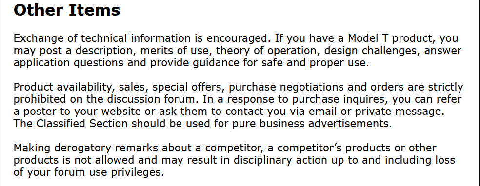 But even expressing an opinion in this thread makes me fear being banned, unable to purchase parts or vehicles on the forum. I prefer not to hear a knock on the door of my account in the night, and having folks stand in judgment in a closed process and sent off to banishment. So I remain a lurker here, reading but not posting much.