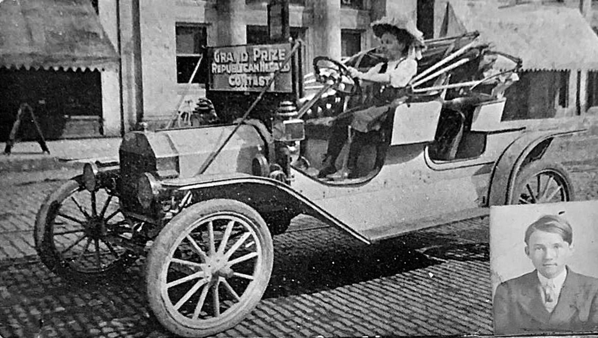 I love the gray 1909 roadster! It has the two bolt front body bracket, and three bolt center body bracket. The picture is oddly distorted. Often a lens problem in early photographs. I wonder if it might have been cut out of a much larger photo? However numerous minor flaws in the image look more like the cheaper films of the era, and not like the larger format glass plates or other methods used for larger photos. The fellow's photo in the corner also raised some questions"? Like is he connected with the car or the story behind it? The writing on the windshield indicates the car might have been a prize in a local contest?