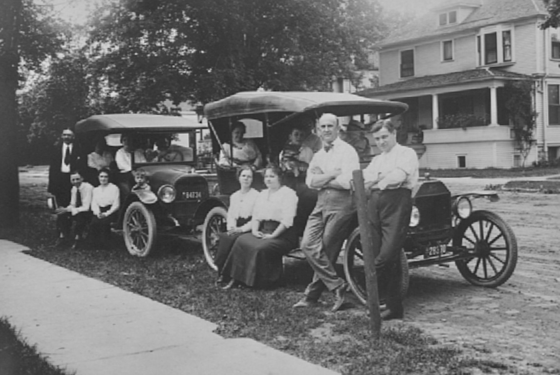 Note the 1913/'14 with the after-market cowl cover and windshield on it. Also notice the cowl lamp and Firestone type demountable wheels.