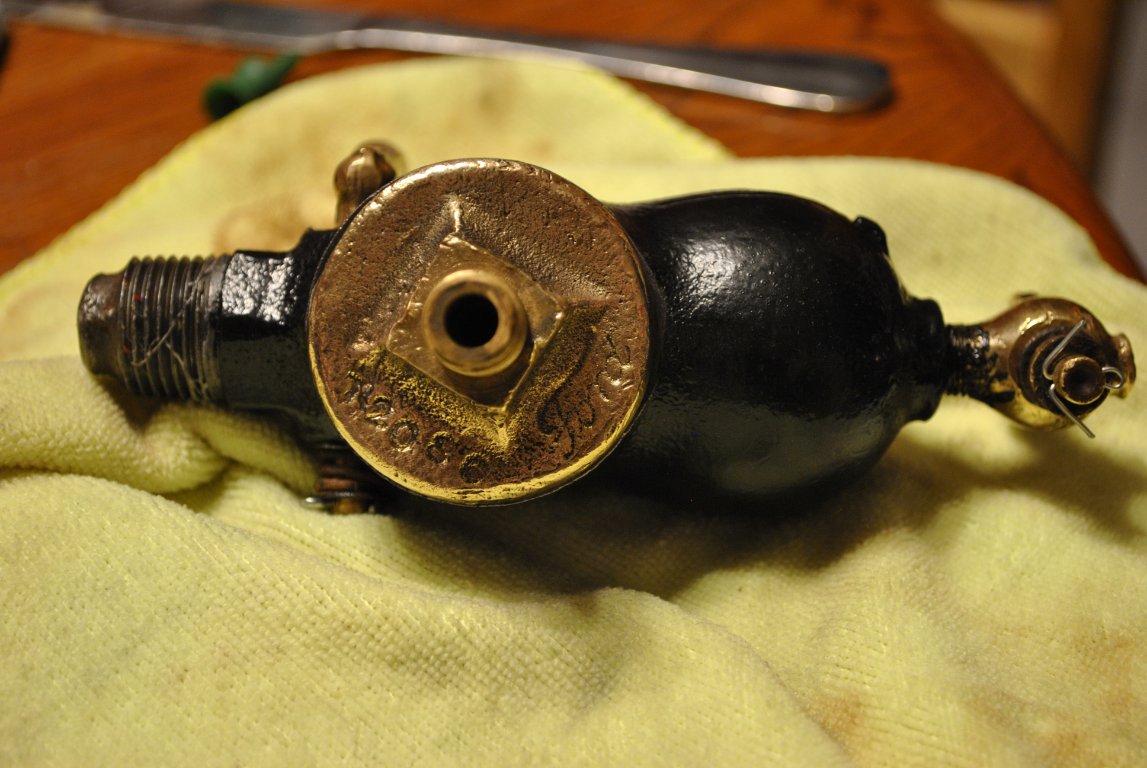 Yesterday I mentioned "...sparking inside between the armature commutator and the 4-holed ring that lets the brush plate rotate" on the generator. Upon disassembly I could see a ridge worn on the commutator end. Also a bright spot was worn on the ring (see arrow). Thinking the latter was a high spot I tapped it down some. Then I cleaned up the end of the commutator on the lathe. On reassembling I have .025 clearance now. I also installed new bearings on both ends.